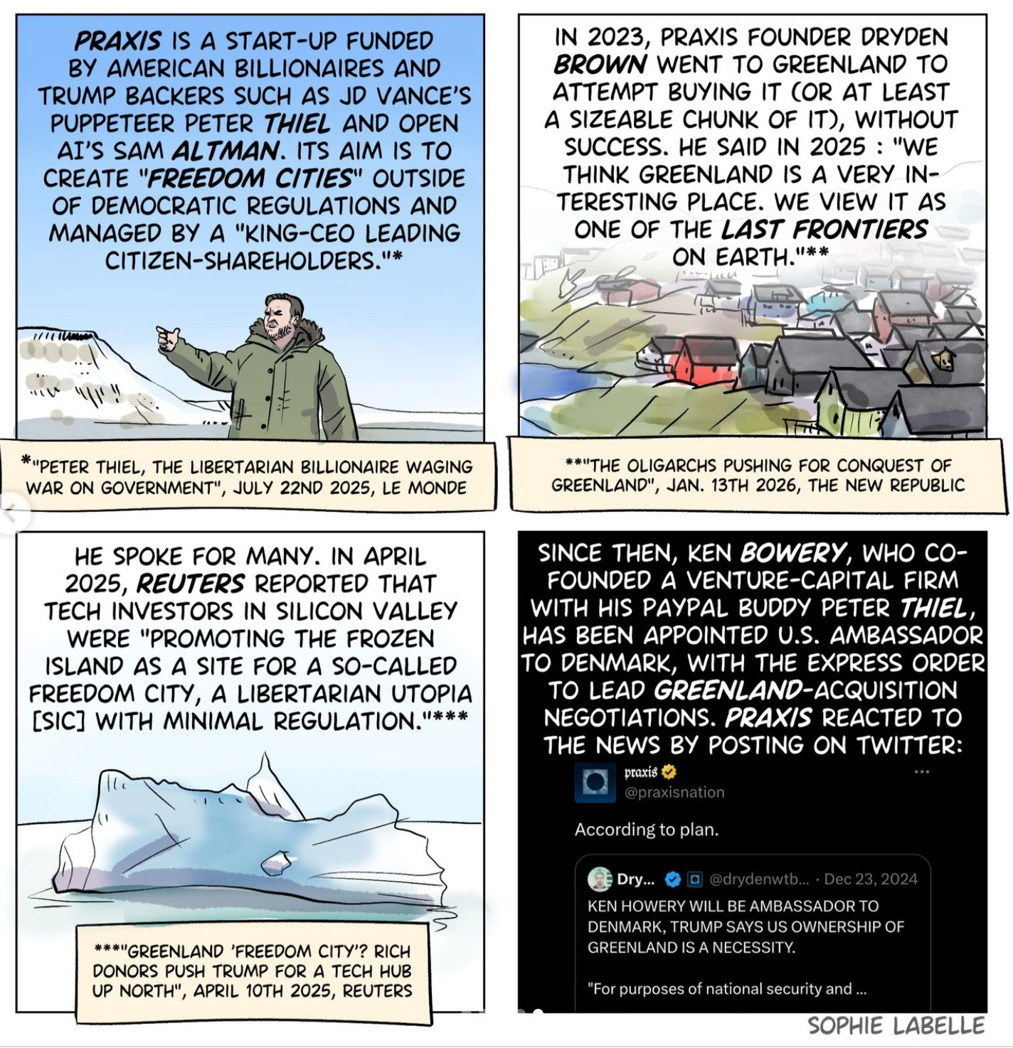 In 2023, Praxis founder Dryden Brown went to Greenland to attempt buying it (or at least a sizeable chunk of it), without success. He said in 2025: “We think Greenland is a very interesting place. We view it as one of the last frontiers on earth.” (Source for the Brown quote: Casey Michel for The New Republic “The Oligarchs Pushing for Conquest” January 19, 2026.)
