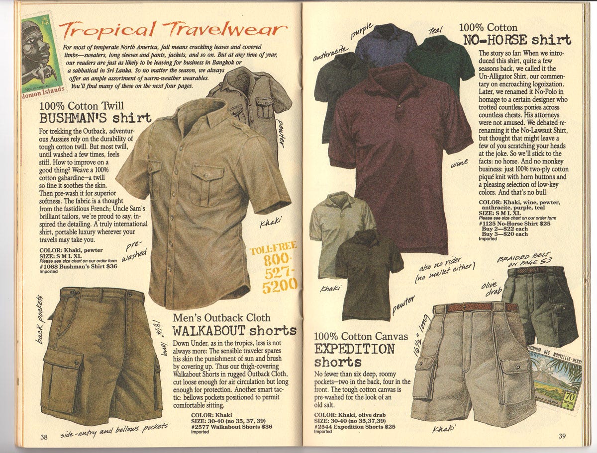 I was Banana Republic’s editorial director in the glory days of hand-illustrated paper catalogs and wildlife soundtracks in stores. In the beginning, the company had sold military surplus from around the world, but when supplies ran short it got into the design-and-manufacture business. We sold a polo shirt that was originally called the No-Alligator Shirt, “our commentary on encroaching logoization.” A year later the name was changed to No-Polo “in homage to a certain designer [cough Ralph Lauren cough] who trotted countless ponies across countless chests.” Alas: “His attorneys were not amused. We debated renaming it the No-Lawsuit Shirt, but thought that might leave a few of you scratching your heads at the joke. So we’ll stick to the facts: no horse. And no monkey business: just 100% two-ply cotton piqué knit with horn buttons and a pleasing selection of low-key colors. And that’s no bull.”