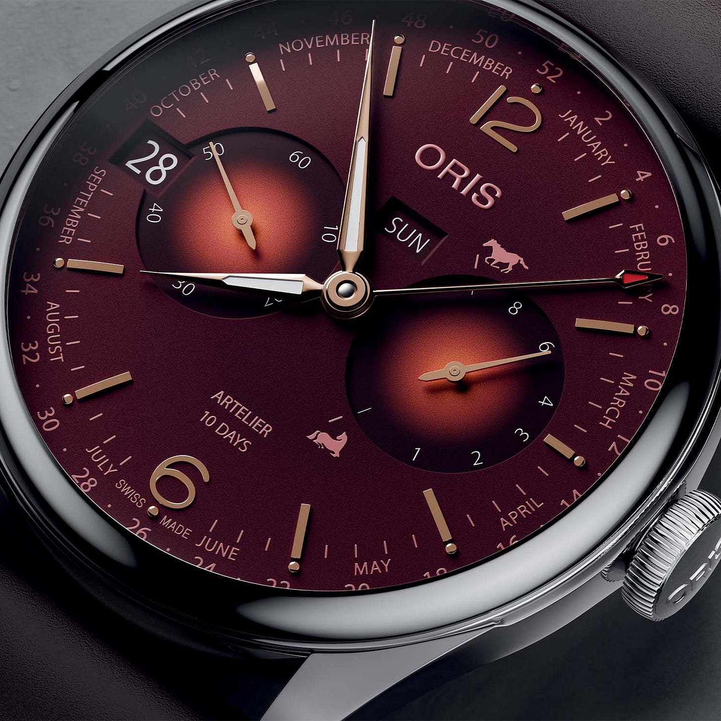 Oris, a Swiss maker of “luxury” watches whose name sounds a little like “horse” but is in fact derived from a small brook, the Orisbach, near company headquarters, is selling a special Year of the Fire Horse model in a limited edition of 88. (Why 88? Glad you asked.) The company “has decided to have some fun and added two pink horses to indicate the remaining power reserve in the mainspring. The galloping horse at the top indicates a full 10-day tank, while the horse resting below indicates the watch needs winding.” It sells for 6,650 Swiss francs (about US$8,500).